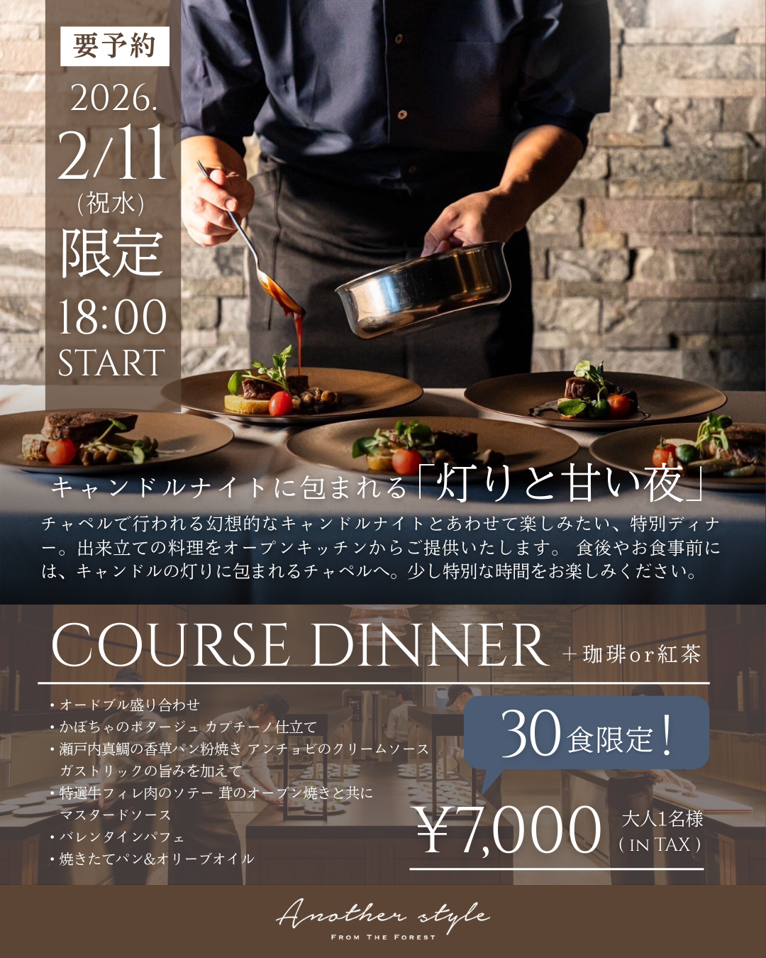 キャンドルナイトとともにお楽しみいただける、特別なコースディナーをご用意。こちらも30食限定になりますので、お早めにご予約ください。